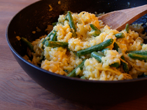 意大利燴飯是意大利北部的特色菜,具有非常豐富的混合口感,可以演化出多種味道的組合。這道菜以少量藏紅花米飯為主體,可以搭配各種白色肉類-此時