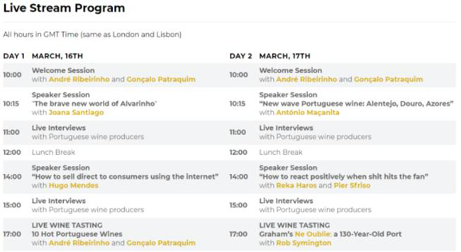 3月16日-17日,舉辦了為期兩天的虛擬現(xiàn)場(chǎng)直播交易活動(dòng),免費(fèi)幫助葡萄牙葡萄酒生產(chǎn)商展示他們計(jì)劃帶到國際貿(mào)易博覽會(huì)參展的葡萄酒。直播貿(mào)易目前以免費(fèi)的形式進(jìn)行,開放注冊(cè)。