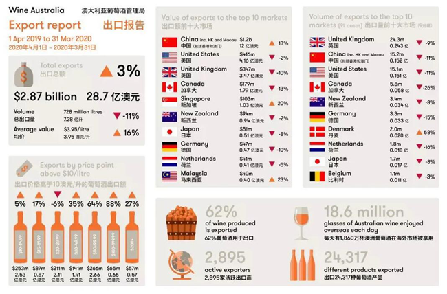 關(guān)于3月份的統(tǒng)計(jì)數(shù)字,澳大利亞葡萄酒管理局統(tǒng)計(jì)數(shù)字顯示,出口額相比上年同期降低了43%。今年1~3月份澳洲酒對(duì)華出口額也降低了14%,下降幅度明顯,而這主要是因?yàn)橐咔樗鶎?dǎo)致。即使這樣,如果算上2019年的后三個(gè)季度,澳洲酒在中國(guó)仍然強(qiáng)勢(shì)增長(zhǎng),可見2019年奠定的優(yōu)勢(shì)有多大!