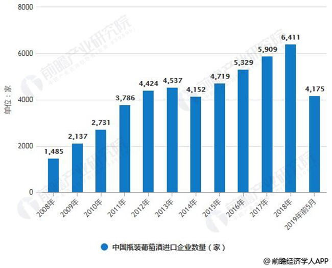 2008-2019年前5月中國(guó)瓶裝葡萄酒進(jìn)口企業(yè)數(shù)量統(tǒng)計(jì)情況